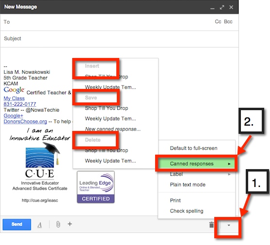 Canned Response can be found on the bottom of an email draft – 1 (bottom right, small arrow). Once it’s chosen, additional choices can be made. Choose – 2– ‘Canned Response’. From here, you can: ‘Save a Canned Response’ (save to use in the future, like I did with my ‘Update’), ‘Insert a Canned Response’ (like I do each Thursday), or ‘Delete a Canned Response’.