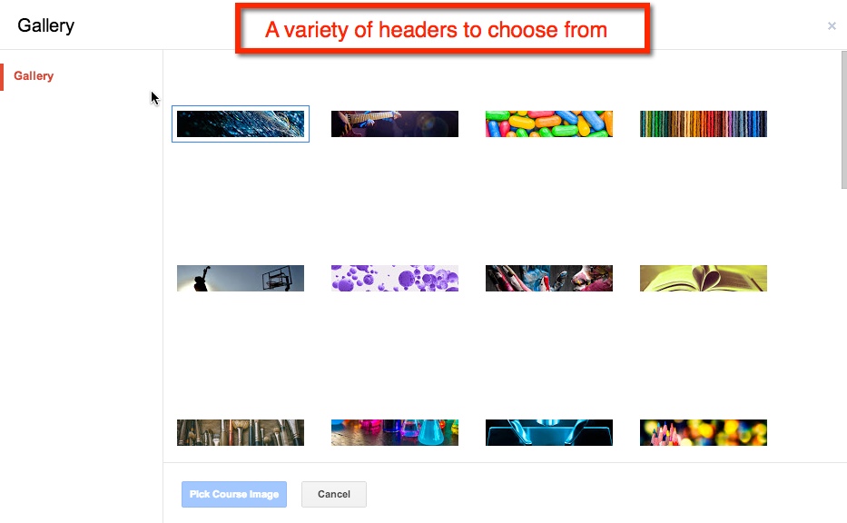 So you’re not fond of the purple bubbles? Not a problem. When your cursor hovers over the header, the option to ‘Change Picture’ appears in the lower right corner of the header. Once you choose that other options will appear.