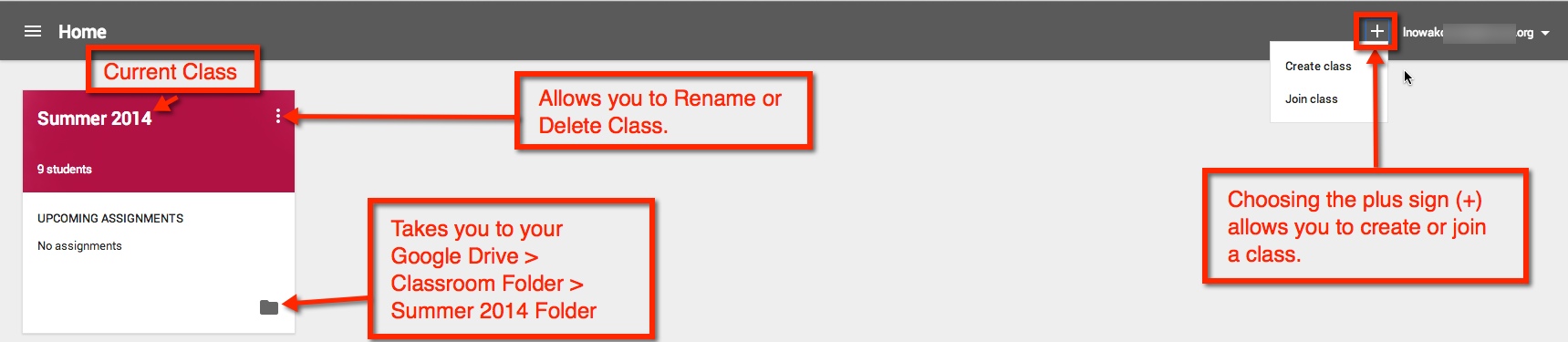So here is a BASIC overview from the teacher’s viewpoint. When you first open Google Classroom, a folder (Classroom) is automatically created for you in your Google Drive. Once open, you will be taken to the ‘Home’ screen. Here I have a current class set up and have highlighted some of the features available. If it is your first time, you can easily set up a class by choosing the plus sign (+) next to your user information at the top right corner.