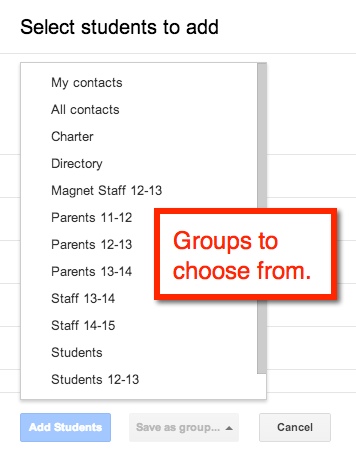 To manually add students choose the blue ‘ADD’ button. I can then either checkmark students from my contact list or select an entire ‘group’.