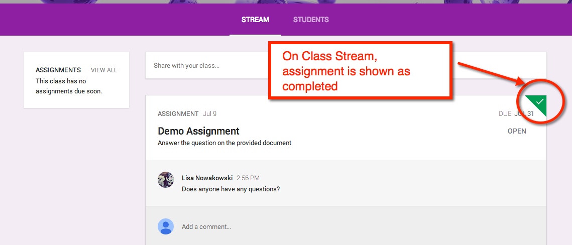 When the student has submitted an assignment, it will be noted in their Stream.