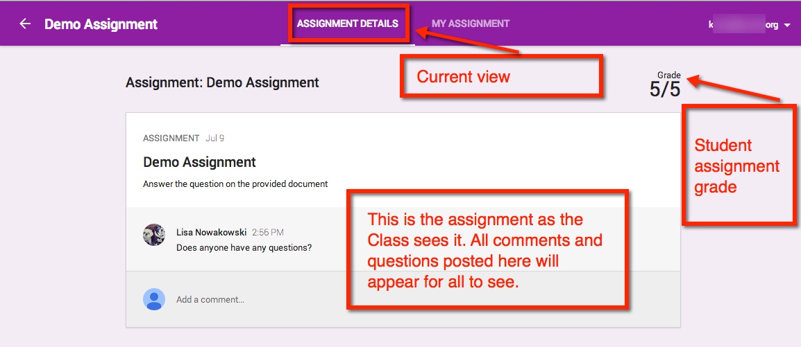 Once the teacher has graded the assignment, it will be ‘Returned’ to the student. The student will have full editing rights (the teacher will be given commenting rights). They can view the score and any comments in My Assignment page. When the student views the score from their Assignment Details page, they will only see comments made to the entire class. Private comments between the teacher and student are on My Assignments page.