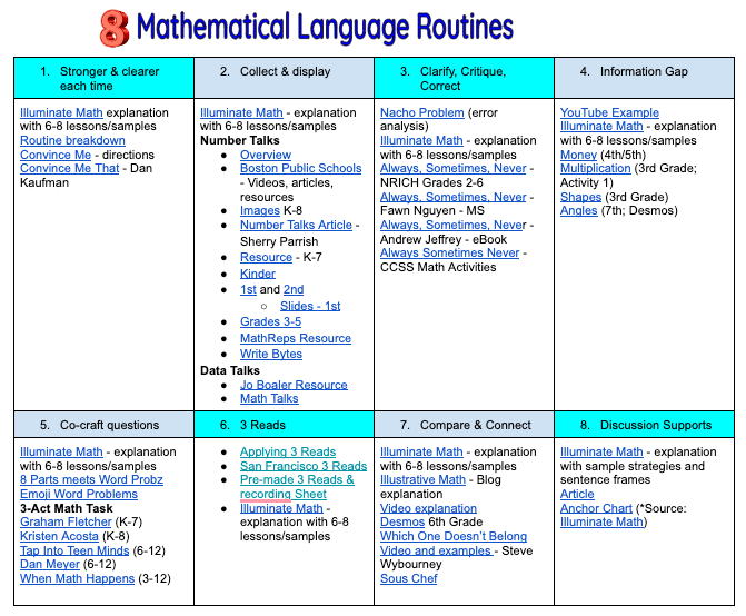 Looking back at the series of Mathematical Language Routines (MLRs) we have explored, we can see that their collective aim is to foster robust mathematical discussions and enhance language proficiency among students. These routines serve diverse purposes, such as refining ideas through structured conversation (Stronger and Clearer Each Time), stabilizing oral language as a reference (Collect and Display), refining written arguments through critique (Critique, Correct, and Clarify), promoting collaborative problem-solving through information sharing (Information Gap), empowering students to craft mathematical questions (Co-Craft Questions and Problems), facilitating comprehension and negotiation of math texts (Three Reads), and encouraging comparison and connection between various mathematical approaches and representations (Compare and Connect). Together, these MLRs not only elevate student participation and conversation but also cultivate meta-awareness of language, fostering a deeper understanding of mathematical concepts.