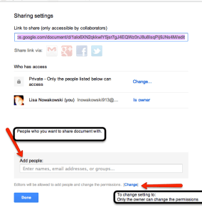 Type the names of those you wish to share with. You can allow others to edit or view. The default setting is ‘edit’. If you would like to retain control over who is allowed to have access to your document, click on the ‘change’ link on the bottom right. Change the ‘share settings’ to ‘Only the owner can change the permissions’. When finished, click ‘Done’.