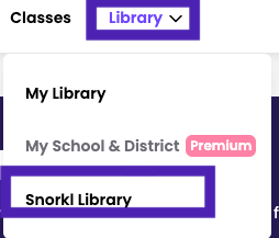 So, where might you find them on the website? I’m so glad you asked. Log in to Snorkl App. Once logged in, navigate to the ‘Library’ tab. Click on the down arrow and select ‘Snorkl Library’.