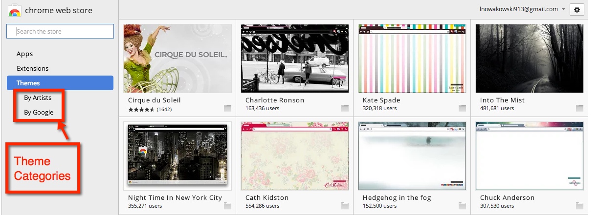 It’s easy to change: Navigate to the Chrome Web Store. The default is set to Apps. Following the list to the end, you will see Themes.
