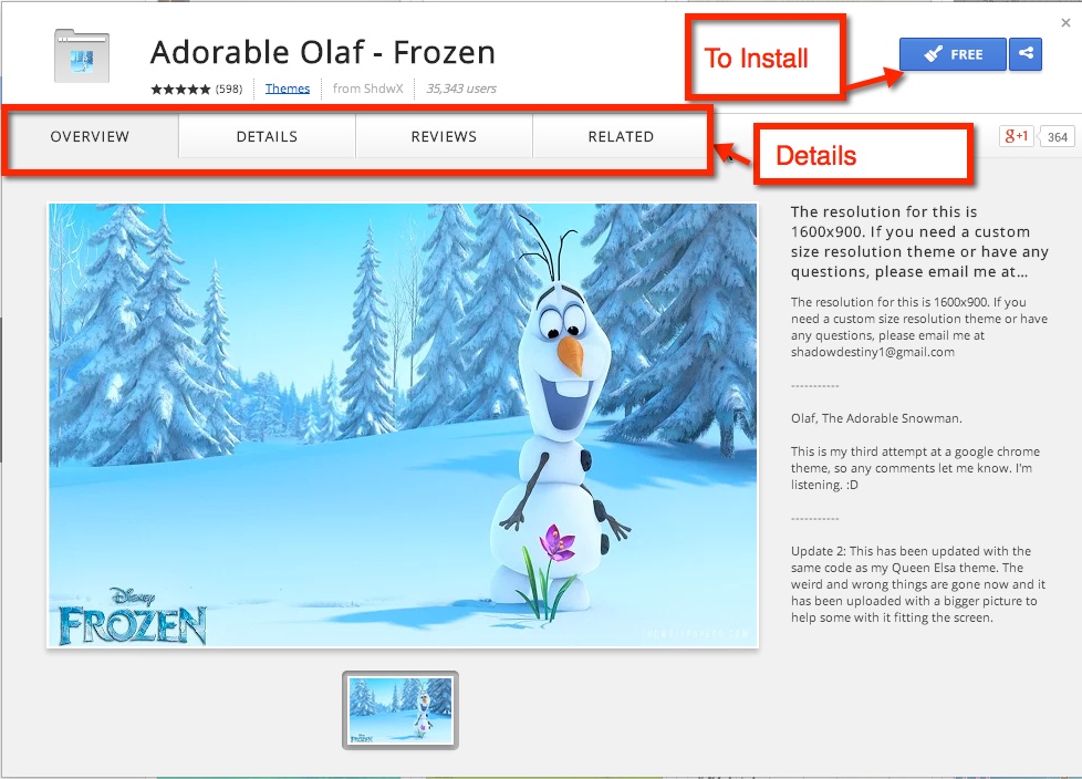 Once you find a theme you like, click on it. You can see an overview, details, and reviews. If you choose to use the theme, simply click on the blue button, in this case the theme was Free.
